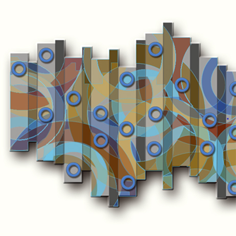 que se puede mirar a distancia, pero que es fascinante al apreciarlo desde la misma fibra. Los hilos o hebras son reemplazados por listones de madera, en donde el relieve, la trama, y en especial la interacción de color, son protagónicos.